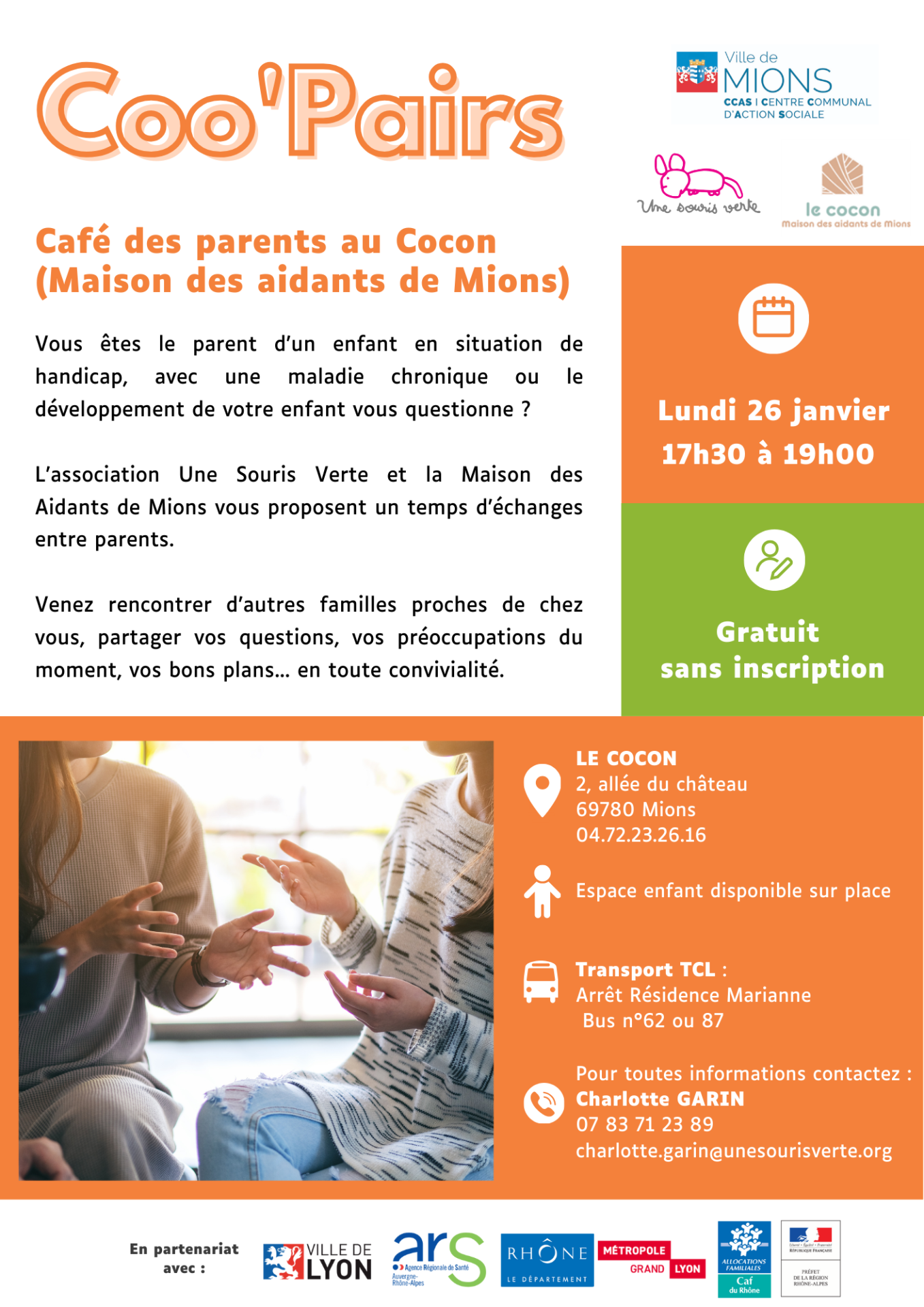 L’association Une Souris Verte et la Maison des Aidants de Mions vous proposent un temps d’échanges entre parents. Venez rencontrer d’autres familles proches de chez vous, partager vos questions, vos préoccupations du moment, vos bons plans… en toute convivialité.