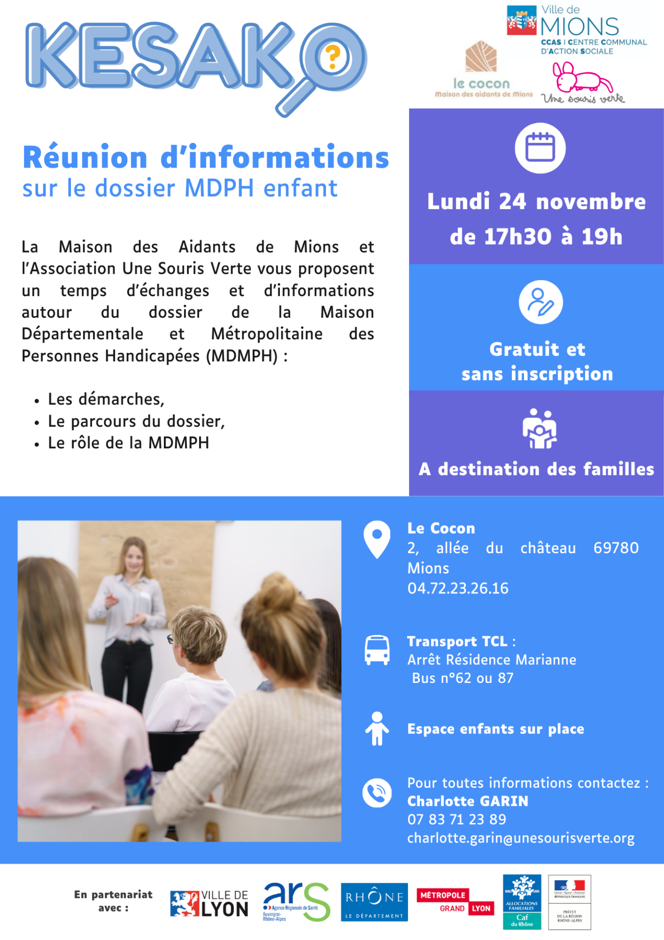 La Maison des Aidants de Mions et l’Association Une Souris Verte vous proposent un temps d’échanges et d’informations autour du dossier de la Maison Départementale et Métropolitaine des Personnes Handicapées (MDMPH) :
