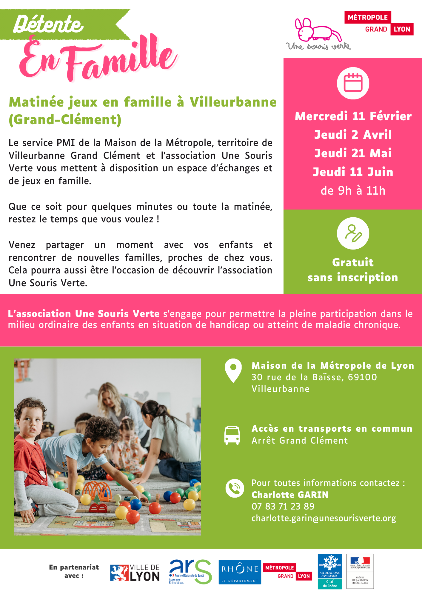 Le service PMI de la Maison de la Métropole, territoire de Villeurbanne Grand Clément et l’association Une Souris Verte vous mettent à disposition un espace d’échanges et de jeux en famille.