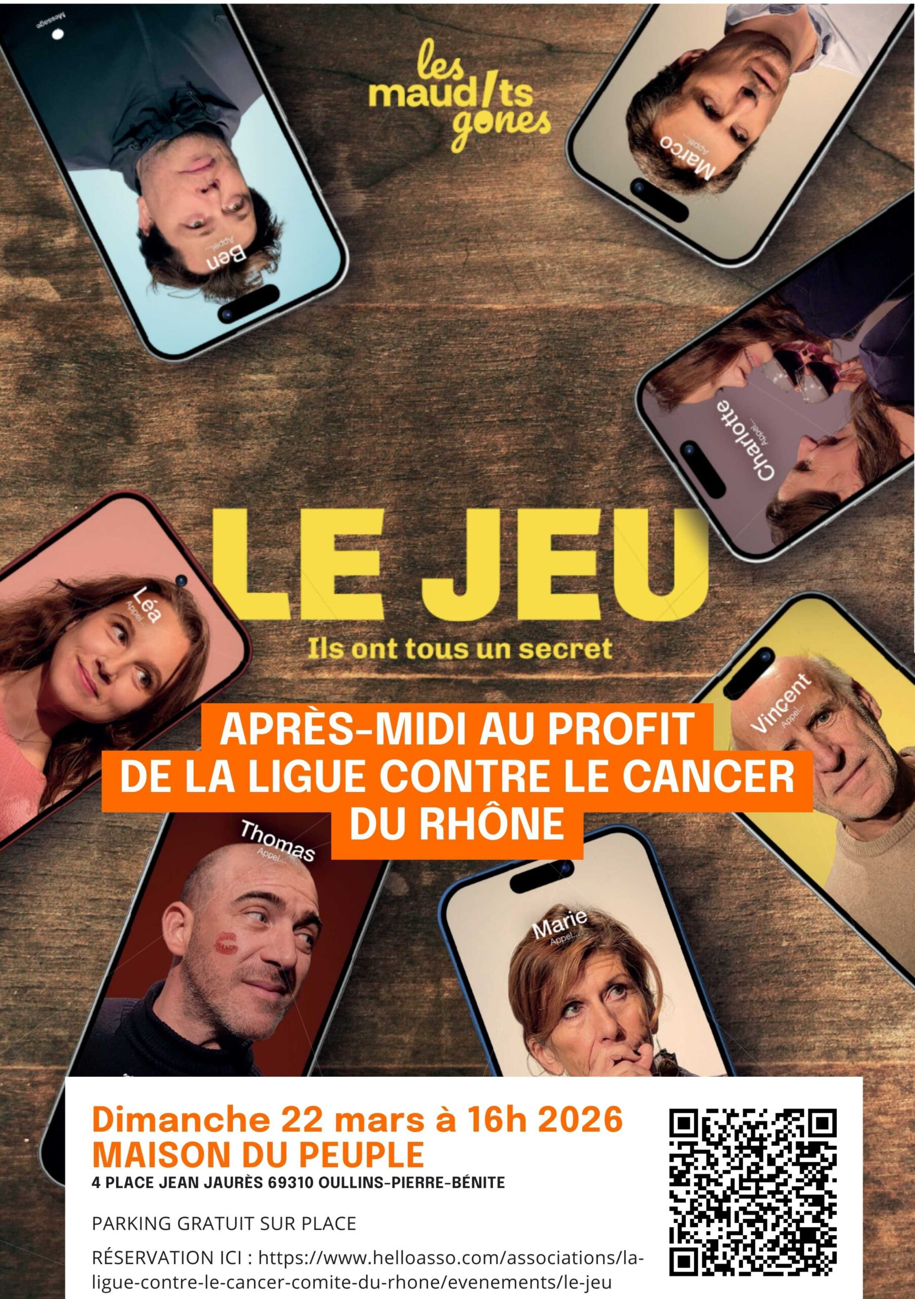 La troupe Les Maudits Gones présentera la pièce Le Jeu, une œuvre pleine de rythme et d’émotions, mêlant humour et sensibilité. Portée par des comédiens passionnés, cette représentation promet un moment convivial et solidaire.