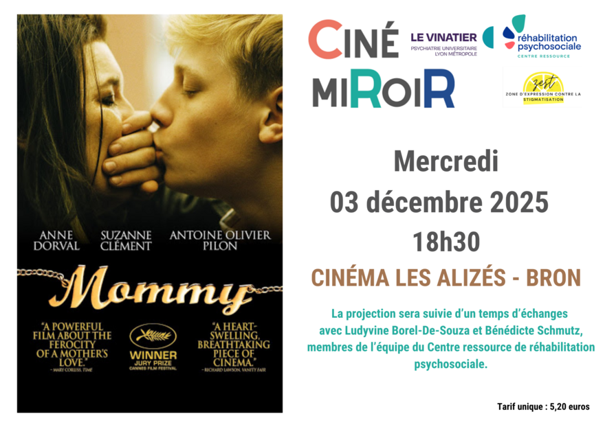 Le Centre ressource de réhabilitation psychosociale, en partenariat avec le cinéma Les Alizés (Bron), organise prochainement une nouvelle édition de Ciné miRoiR sur le film « Mommy », réalisé par Xavier Dolan et sorti en 2014.